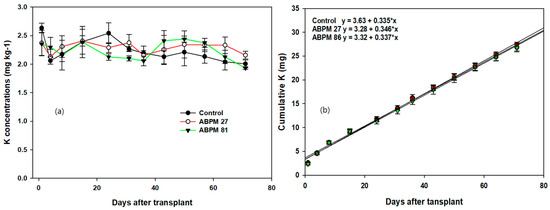 Changes in K concentrations (a) and cumulative K (b) described with the linear equation in soils treated with ABPM 27 and ABPM 86 during cultivation. ABPM 27 and ABPM 86 refer to biochar pellets inoculated with P. fluorescens 22BCO027 and B. megaterium 22BCO086, respectively. Error bars display standard deviation.