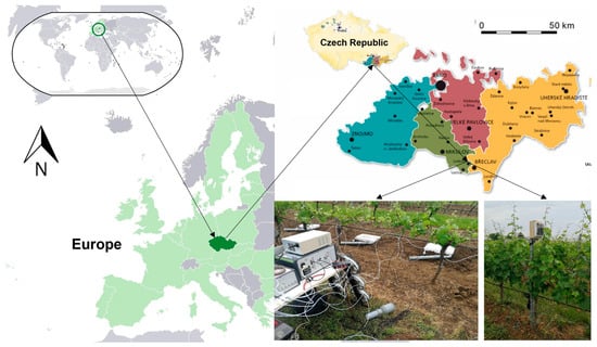 Experimental measurements were conducted in 2023 and 2024 under the environmental conditions of the South Moravian region in the Czech Republic. The study site (coordinates: 48° 47′ 30″ N, 16° 47′ 56″ E) is located 1.5 km southwest of the village of Lednice, in the vineyard block “Na Valtické” (Figure 1).