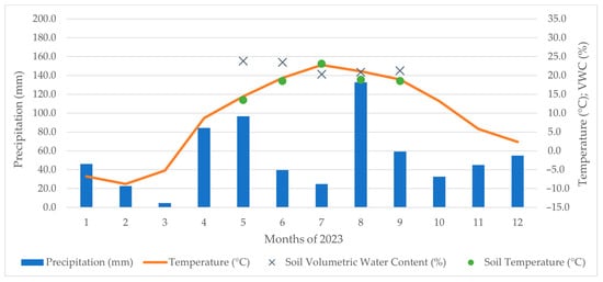 Weather conditions in experimental sites in year 2023 and the soil temperature and VWC levels at the time of measurement.