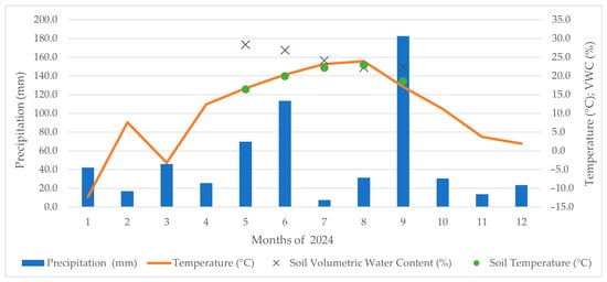 Weather conditions in experimental sites in year 2024 and the soil temperature and VWC levels at the time of measurement.