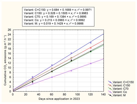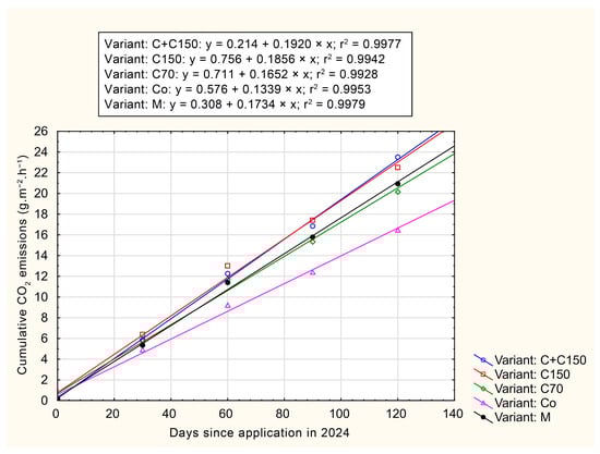 Figure 4 and Figure 5 illustrate cumulative CO2 emissions, expressed in g C-CO2·m−2·h−1, as a function of time since the initiation of measurements. Both graphs indicate that the highest cumulative CO2 emissions were observed in the C+C150 variant. Over a 120-day period, the cumulative CO2 emission values for each variant range from 11 to 24 g C-CO2·m−2·h−1, which, when recalculated, correspond to 9.64–21.03 Mg C-CO2·ha−1·y−1. These values represent the means of three replicates per treatment and are intended to illustrate cumulative trends rather than to provide statistical comparisons at each time point.