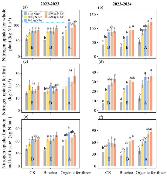 The nitrogen (N) uptake for whole plant (a,b), fruit (c,d), and stem and leaf tissues (e,f) at five N fertilizer application rates under different soil amendments: biochar, organic fertilizer, and CK (without biochar or organic fertilizer) during 2022–2023 and 2023–2024 cropping seasons. Means with different small alphabetical letters show significant differences among the five inorganic N treatments according to the least significant difference test at the 95% level of confidence. Means with different capital alphabetical letters show significant differences among CK, biochar, and organic fertilizer treatments according to the least significant difference test at the 95% level of confidence.