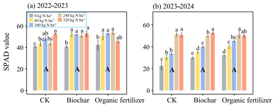 The SPAD value at five nitrogen (N) fertilizer application rates under different soil amendments: biochar, organic fertilizer, and CK (without biochar or organic fertilizer) during the 2022–2023 (a) and 2023–2024 (b) cropping seasons. Means with different small alphabetical letters show significant differences among the five inorganic N treatments according to the least significant difference test at the 95% level of confidence. Means with different capital alphabetical letters show significant differences among CK, biochar, and organic fertilizer treatments according to the least significant difference test at the 95% level of confidence.