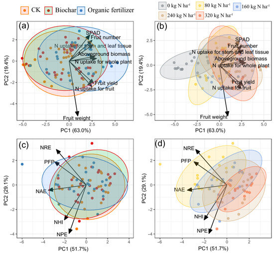 Principal component analysis (PCA) of yield-related parameters (a,b), and N use efficiency (c,d) related parameters at five nitrogen (N) fertilizer application rates under different soil amendments: biochar, organic fertilizer, and CK (without biochar or organic fertilizer) over two experimental years.