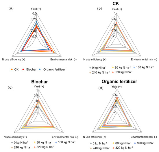 To comprehensively evaluate the influence of the combined application of biochar and organic fertilizer with N fertilizer, three important datasets—yield performance, NUE, and environmental risks—were integrated into a unified assessment. Yield-related indicators included fruit yield, fruit number, fruit weight, and aboveground biomass. NUE was evaluated based on PFP, NAE, NRE, NPE, and NHI. Environmental risks were assessed across seven environmental impact categories per kg of fruit yield produced. Yield performance was assigned a weight of 50%, considering it the primary factor, while NUE and environmental risks, reflecting resource utilization and sustainability, respectively, were each assigned a weight of 25%. Finally, to eliminate the influence of differing units and scales among these indicators, the datasets were standardized using the Z-score method prior to comparison.
