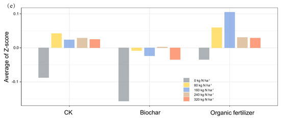Z-score assessment representing the specific variable (fruit yield, nitrogen use efficiency, and environmental risk) score (a–d) and average score (e) at five nitrogen (N) fertilizer application rates under different soil amendments: biochar, organic fertilizer, and CK (without biochar or organic fertilizer).