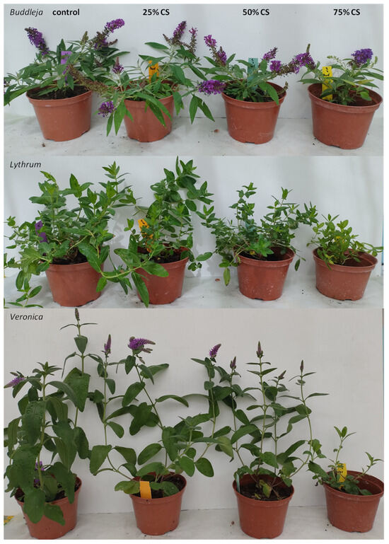 Cuttings of the Lythrum rooted well in all the substrates, with efficiency ranging from 83.3% in the substrate with the highest CS content to 100% in the control substrate and the substrate containing 25% CS. The lowest rooting percentage across all the substrates tested was recorded for Veronica. The 75% addition of CS to the substrate at the rooting stage caused only 11% of Veronica cuttings to produce root. Since the number of rooted cuttings in Veronica and Buddleja in 75% CS were extremely low and the overall quality of the survived plantlets was poor as seen in Figure 3, we decided to exclude this treatment from the further statistical analyses for rooting stage plants.