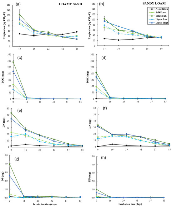 Soil respiration (a,b) and content of DOC (c,d), DN (e,f), and DP (g,h) in the leachates per microcosm during incubation as affected by the soil type, the addition rate, and the state. Values represent means ± SEM (n = 4). DOC: Dissolved Organic C, DN: Dissolved N, DP: Dissolved P.
