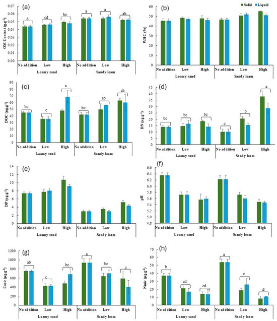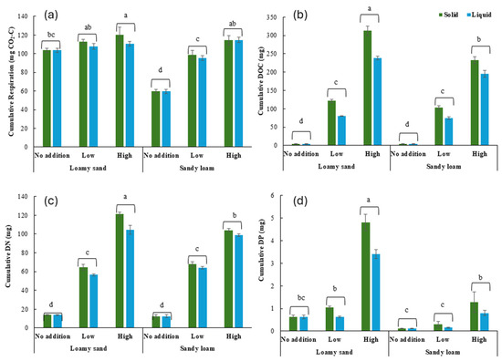 Cumulative DP content was on average 3 times (302%) higher in loamy sand soil than in sandy loam soil, 2 times (186%) higher at the high addition rate than at the no and low addition rates, and 43% higher in the solid state than in the liquid state (Figure 2d). The effect of the addition rate was, however, stronger in loamy sand soil than sandy loam soil, with DP content at the low and high addition rates being, respectively, 92% and 767% (loamy sand) and 35% and 561% (sandy loam) higher than at the no addition rate.
