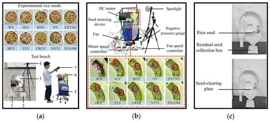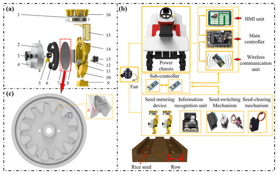 Rice (Oryza sativa L.), an annual to biennial herbaceous plant in the Poaceae family, ranks among China’s three staple crops. The promotion of improved varieties can enhance rice yield by at least 20% [1,2]. Plot breeding filed trials serve as indispensable tools for developing new cultivars and permeate all stages of breeding programs [3]. Seeding is the most fundamental operation in plot breeding field trials, and also the most critical, labor-intensive, and time-consuming stage. At present, due to the lack of specialized machinery, rice plot breeding still relies heavily on manual seeding operations, which are time consuming and labor intensive, with low automation and poor operational stability, thereby seriously affecting the accuracy of trial results [4,5]. Therefore, the development of a specialized rice plot seeding machine that closely integrates agronomic requirements with agricultural machinery is of great significance for improving the quality of rice plot breeding operations and expanding the scale of trials.