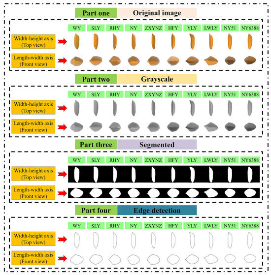 where Lmax, Wmax, and Hmax are the maximum dimensions of the rice seed along the length, width, and height axes, respectively, mm; Lmin, Wmin, and Hmin are the corresponding minimum dimensions along the respective axes, mm.