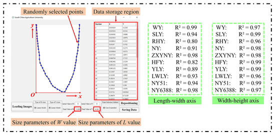 Finally, proportional stacking of seed contours along the length–width and width–height axis was performed for multiple rice varieties, as illustrated in Figure 3. Based on the design parameters of the horizontally oriented shallow bowl-shaped suction holes, a secondary acquisition of the contour coordinate points was carried out using the MATLAB App Designer (version R2020a). The fitted polynomial boundary equations of the suction hole profile were ultimately obtained for both the length–width and width–height sides, expressed as follows: