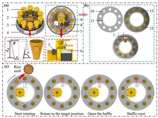Integrating agronomic requirements of rice plot breeding and dimensional parameters of field seed-metering devices [21], ten seed supply boxes were preliminarily determined to be evenly distributed on the seed-switching disc, as shown in Figure 4b. Therefore, for each single operation, the motor needs to rotate 36°, aligning the seed supply box slot with the seed dropping port. Then, a servo MG90S drives the seed supply box baffle to translate linearly along the rack slot track to release the seeds. Finally, the seed supply box baffle resets, completing the seed-switching process, as illustrated in Figure 4c. Based on the number of seed supply boxes and the dimensional parameters of seed supply box covers, the minimum circumference of the seed-switching disc should satisfy [11]: