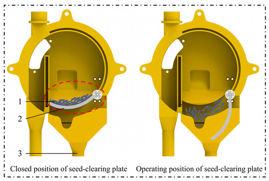 Principle diagram of seed-clearing mechanism action. 1. Rice seeds; 2. seed-clearing plate; 3. seed-clearing channel.