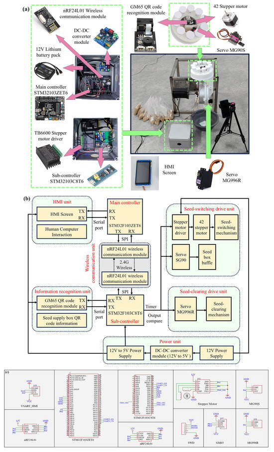 The key electronic components of the automatic seed-switching and clearing control system are shown in Figure 1b. The system mainly consists of a main controller, an HMI unit, a wireless communication unit, a sub-controller, an information recognition unit, a seed-switching drive unit, and a seed-clearing drive unit. The HMI unit adopts the TJC8048X550_011C serial screen (Shenzhen Taojingchi Electronics Co., Ltd., Shenzhen, China); the main controller is based on the STM32F103ZET6 microcontroller (Dongguan embedfire Technology Co., Ltd., Dongguan, China) [13,14,15,16]; the wireless communication unit utilizes the nRF24L01 wireless transmission module (Nordic Semiconductor, Shenzhen, China) [17]; and the sub-controller is implemented using the STM32F103C8T6 microcontroller (SIMMTECH Co., Ltd., Shenzhen, China) [18,19,20]. The information recognition unit employs a GM65 (Hangzhou Grow Technology Co., Ltd., Hangzhou, China) QR code reader module for seed box identification. The seed-switching drive unit consists of a TB6600 stepper motor driver (Pufeide Electric Co., Ltd., Wenzhou, China), a 42 stepper motor (Pufeide Electric Co., Ltd., Wenzhou, China), and a servo MG90S (Shenzhen Ruixin Hengchuang Electronics Co., Ltd., Shenzhen, China). The seed-clearing drive unit is powered by a servo MG996R (SIMMTECH Co., Ltd., Shenzhen, China).