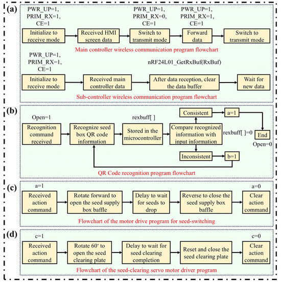 Schematic diagram of the control system software design. (a) Wireless communication program design; (b) information recognition program design; (c) seed-switching servo drive program design; (d) seed-clearing drive program design.