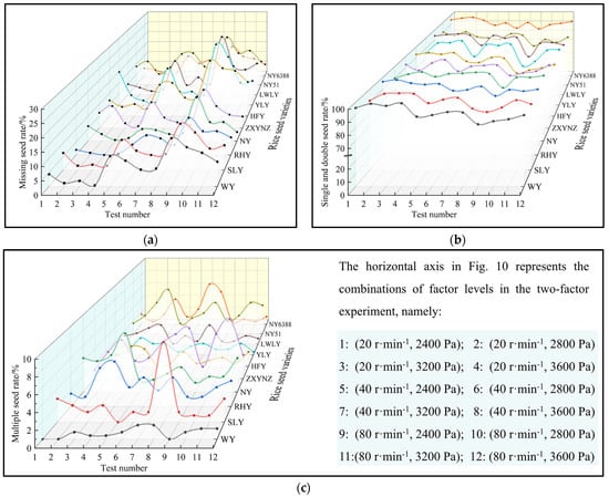 As shown in Figure 10c, when the seed-metering disc rotation speed was 20 r·min−1 and the negative pressure was 2400 Pa, WY, ZXYNZ, YLY, and NY51 exhibited the lowest multiple seed rates. Under the same speed and a negative pressure of 2800 Pa, the lowest multiple seed rates were observed for RHY and NY6388. When the rotation speed was increased to 40 r·min−1 and the negative pressure remained at 2400 Pa, SLY, HFY, and LWLY showed the lowest multiple seed rates. When the rotation speed was increased 60 r·min−1 and the negative pressure remained at 2400 Pa, NY had the lowest multiple seed rate. According to the data in Table 1 and the contour profiles illustrated in Figure 1c, the length–width ratio of the seeds is the primary factor affecting the likelihood of multiple seeds being adsorbed by a single suction hole. The reason for the above trends is that WY, ZXYNZ, YLY, NY51, RHY, and NY6388 possess relatively lower length–width values and more flattened seed shapes, which favor single or double seed occupancy within the suction hole. Additionally, these varieties have relatively lower thousand kernel weight and lower static friction coefficients along the L-H side, which helps reduce the probability of multiple seed pickup under lower negative pressure and slower rotation speeds. In contrast, SLY, HFY, LWLY, and NY—due to their lower friction and length–width ratios—are more susceptible to multiple seed adsorption along the length–height axis under low pressure and low speed conditions. Therefore, increasing the rotation speed of the seed-metering disc is necessary to reduce the contact time between the seed population and the seed-metering disc surface, thereby lowering the multiple seed rate. As shown in Table 6, rotation speed had a highly significant effect on the multiple seed rates of WY and NY, while it had no significant effect on SLY, RHY, ZXYNZ, HFY, YLY, LWLY, NY51, and NY6388. Negative pressure had a highly significant effect on WY, NY and NY51, a significant effect on ZXYNZ, and no significant effect on SLY, RHY, HFY, YLY, LWLY, and NY6388.