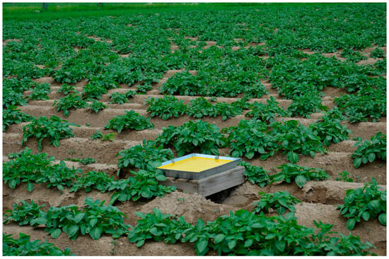 The flight of the aphids was also monitored by a yellow water trap placed in the Obciny locality (2019: 49.6238278 N, 15.5952353 E) over a 5-year period (2019–2024) (Figure 1). The yellow water trap was 13 km away from the suction trap. The yellow water trap was placed in a commercial potato field without insecticide treatment against aphids. In certain years, the trap was placed at the height of the upper leaf layer of the potato plants, 50 m from the edge of the field (Figure 2). The aphids were collected 3 times a week. For the statistical analyses, the numbers of caught aphid individuals in the yellow water trap were expressed as weekly catches to match the dates of catches in the suction trap. Seven aphid species were determined, i.e., M. persicae, P. humuli, A. nasturtii, A. fabae, B. brassicae, Aulacorthum solani, and Macrosiphon euphorbiae. The total number of the 7 aphid species monitored by the yellow water trap and the 3 species monitored by the suction trap identified per week was recorded.