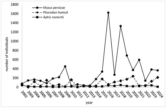 The total number of monitored aphid specimens captured in the suction trap at the Lipa site between 2002 and 2024 was 10,395. Of these, M. persicae accounted for 7928 individuals, P. humuli for 2003, and A. nasturtii for 464 (Table 1, Supplementary Table S1). The proportional representation of each species from the total captures was as follows: M. persicae—76%; P. humuli—19%; and A. nasturtii—5%. The abundance of these species varied considerably across the years.