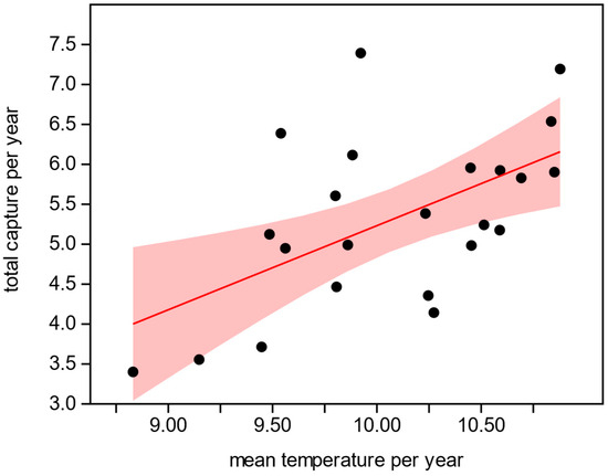 The influence of average temperature and the sum of precipitation on the sum of M. persicae and P. humuli captures per year and in spring, summer, and autumn in the years 2002–2024 was analysed using the Pearson correlation test. Due to the low number of A. nasturtii captures, regression analysis for this species was not feasible. For M. persicae, these analyses were also carried out separately for captures in the years 2002–2013 and the years 2014–2024 concerning the ban of neonicotinoids [37].