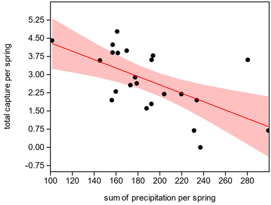 The correlation analysis between spring precipitation and spring abundance of M. persicae is shown in Figure 5. Pearson’s analysis revealed a statistically significant correlation between spring precipitation and the total spring capture of M. persicae (rp = −0.597, p = 0.003, R2 = 0.356). The abundance of M. persicae increased in the years with low precipitation in spring. The correlation between spring precipitation and total spring capture of P. humuli was not significant (rp = 0.117, p = 0.595, R2 = 0.014).