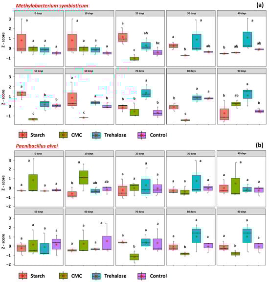 The viability of bacteria in inoculant formulations prepared with different additives, starch (1%), CMC (0.25%), trehalose (1.5%), and control (no additives), and stored for different periods (0, 10, 20, 30, 40, 50, 60, 70, 80, and 90 days). Methylobacterium symbioticum (SVMT) (a); Paenibacillus alvei (SVPA) (b). CFU values were standardized using z-score transformation. Letters above the boxplots indicate statistically significant differences among treatments within each time point, as determined by Tukey’s test at the 5% significance level. Identical letters denote means that are not significantly different.