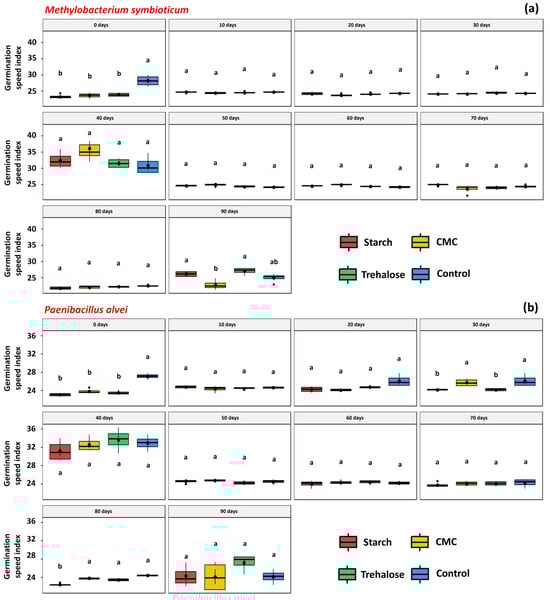Germination speed index (GSI) of Glycine max L. seeds treated with inoculant formulations prepared with different additives, starch (1%), CMC (0.25%), trehalose (1.5%), and control (no additives), and stored for different periods (0, 10, 20, 30, 40, 50, 60, 70, 80, and 90 days). Methylobacterium symbioticum (SVMT) (a) and Paenibacillus alvei (SVPA) (b). Above the boxplots, the letters refer to the comparison of means given by the Tukey test at 5% probability. Identical letters denote means that are not significantly different.
