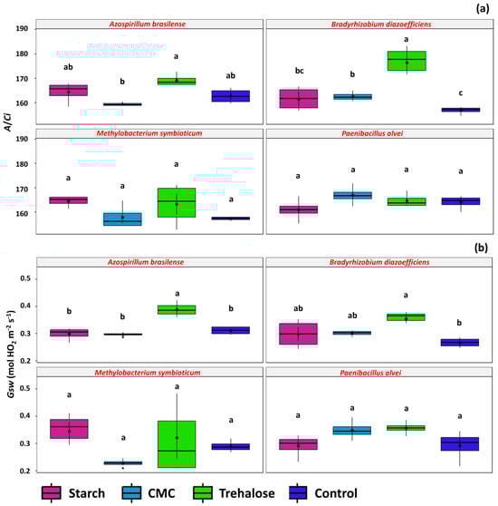 Gas exchange parameters observed in Glycine max L. plants obtained from seeds treated with inoculant formulations prepared with the rhizobacteria Azospirillum brasilense (SVI01), Bradyrhizobium diazoefficiens (SVI02), Methylobacterium symbioticum (SVMT) and Paenibacillus alvei (SVPA) and different additives: starch (1%), CMC (0.25%), trehalose (1.5%), and control (no additives). Carboxylation efficiency (A/Ci) (a) and stomatal conductance (Gsw) (b). Above the boxplots, the letters refer to the comparison of means given by the Tukey test at 5% probability. Identical letters denote means that are not significantly different.