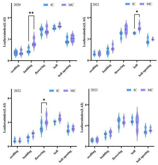 3.1. The Effect of Jujube–Cotton Intercropping on Cotton Leaf Area Index