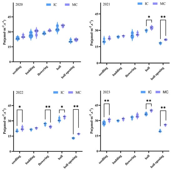 3.2. The Effect of Jujube–Cotton Intercropping on Cotton Net Photosynthetic Rate