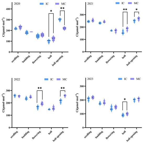 3.4. The Effect of Jujube–Cotton Intercropping on Cotton Intercellular CO2 Concentration