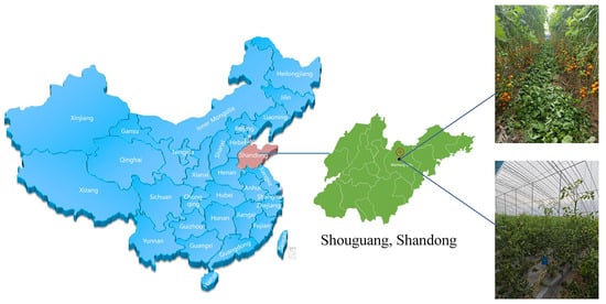 The tomato image dataset was collected from Xichen Village, Wenzhuang Street, Shouguang City, Shandong Province (118.44° E, 36.55° N), as shown in Figure 1. The data were collected during the tomato harvest from September to October 2024, covering different time periods in the morning, noon, and afternoon. The dataset was collected under diverse natural lighting conditions, including sunny, cloudy, and overcast weather, to enhance the robustness of the model across varying illumination environments. Image acquisition was performed using a Xiaomi 13 Pro smartphone (Xiaomi Technology Co., Ltd., Beijing, China) equipped with a Sony IMX989 1-inch sensor (Sony Group Corporation, Tokyo, Japan), offering a resolution of 50 megapixels. To ensure annotation consistency, all instance segmentation masks were manually labeled by the same annotator. After annotation, each sample was carefully reviewed to correct potential boundary errors or label inconsistencies.