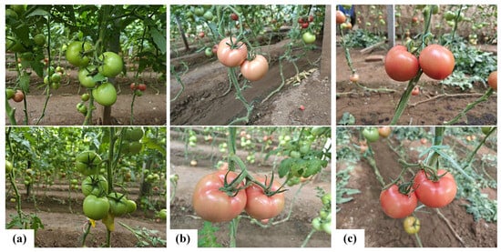 Tomato is the most typical greenhouse vegetable crop globally, with rich nutritional value and high economic value [1]. The selective harvesting of tomatoes represents a key link in agricultural production and quality control, which directly affects many aspects such as fruit quality, taste, storage, and economic benefits [2]. Determining tomato maturity serves as the core basis for selective harvesting, affecting product quality, market value, and supply chain efficiency [3,4]. Therefore, accurate maturity determination in greenhouse environments holds significant importance for improving harvesting efficiency, ensuring fruit quality, promoting intelligent picking, and optimizing production management.