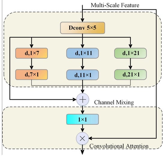 The core of SegNext_Attention lies in the Multi-Scale Convolutional Attention Module (MSCA). The MSCA architecture, as illustrated in Figure 6 [34], consists of three key components: Depthwise convolution for aggregating local spatial information; multi-branch depthwise strip convolution for capturing hierarchical multi-scale contextual features; and 1 × 1 convolution for modeling inter-channel relationships.