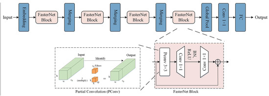 The architecture uses PConv (partial convolution) and PWConv (pointwise convolution) as its main building blocks, and consists of four hierarchical stages, each preceded by an embedding layer or a pooling layer, and the stacking of FasterNet blocks is shown in Figure 7. Each FasterNet block features a PConv layer followed by two PWConv layers, resembling an inverted residual block structure with intermediate channel expansion.