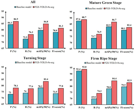 FGS-YOLOv8s-seg shows a significant improvement in identifying all maturity levels compared to the baseline model, as shown in Figure 9. For the mature green stage, the recall and mAP@0.5 have the greatest improvement, increasing by 3.2% and 3.8%, respectively. This is because the GCT module has an advantage in identifying object boundaries and can better separate the boundary feature information between green tomatoes and fruit stems, thereby enhancing the segmentation performance. The most significant improvement in detection performance was observed during the turning stage and the firm ripe stage. In the turning stage, precision, recall, mAP@0.5, and F1-score increased by 5.1%, 3.6%, 5.2%, and 4.3%, respectively; during the firm ripe stage, recall, mAP@0.5, and F1-score increased by 4.5%, 6.4%, and 3.4%, respectively. This is because when detecting tomatoes in the turning and firm ripe stages, the detection is easily interfered with by a combination of light and changes in the orientation of tomato color, leading to misjudgments. The SNA module excels in extracting hierarchical visual features, and when combined with the GCT module, the model can adaptively focus on the scale changes in different colors, thereby enhancing the discrimination performance. These performance improvements for different maturity levels further demonstrate the effectiveness and robustness of the FGS-YOLOv8s-seg model in handling complex and diverse targets.