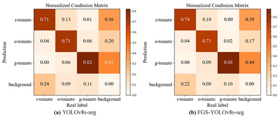 The confusion matrix is a key evaluation tool for calculating the performance of a computer vision model in classification tasks [37]. By analyzing the confusion matrix on the validation set, the effectiveness of the model can be further evaluated. The confusion matrices for tomato fruit recognition before and after improvement are shown in Figure 10. The results show that the FGS-YOLOv8s-seg model improved recognition rates across all maturity stages, achieving 88% for the mature green stage, 73% for the turning stage, and 74% for the firm ripe stage, with a particularly significant 6% increase in mature green stage recognition. Recognition errors for the FGS-YOLOv8s-seg model primarily occurred in two scenarios: 3.9% of background pixels were misclassified as firm ripe tomatoes, and 4.4% of background pixels were misclassified as mature green tomatoes. This is because, while the improved model increases the precision of target detection, the SNA and GCT modules focus on an excessively large scale, causing some pixels in the background to be misdetected as tomatoes. The values on the main diagonal of the confusion matrix represent the number of correctly predicted samples. The larger the diagonal value, the more accurate the model prediction. From the comparison in Figure 10a,b, the improvement in detection precision of the improved model can be seen to be far higher than the impact of false detections.