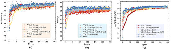 The performance changes in the model with different improvements. (a) Precision, (b) recall, (c) mAP@0.5.