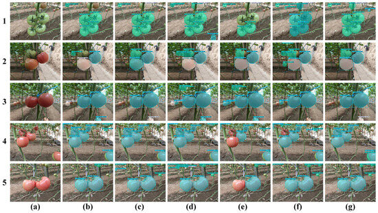 To objectively evaluate the performance of the FGS-YOLOv8s-seg model proposed in this study, comparison experiments were conducted between the FGS-YOLOv8s-seg model and five instance segmentation detection models using the test set. As shown in Figure 13, when tomatoes exhibit overlapping, color interference, or small target sizes, the five instance segmentation detection models encounter misdetection and missed detection issues for distinct target feature maps, particularly for non-target tomatoes in the background. As can be seen from Figure 13, panel e1, e2, and e5, Mask R-CNN has obvious missed detection issues for tomatoes of firm ripe stage. When the image background complexity is high, the false detection probability of YOLOv5s-seg and YOLOv9-seg increases, and YOLOv5s-seg even misses detection (Figure 13, panel b2, b4, c2, and c4). Although YOLOv11 has a smaller number of GFLOPs and faster detection speed, it produces many false detections in complex greenhouse environments, with many non-target tomatoes detected in image backgrounds (Figure 13, panel d3 and d5), which is unfavorable for subsequent selective picking. In contrast, the FGS-YOLOv8s-seg model not only effectively improves the detection capability of small objects for tomato picking, but also improves the detection performance for tomatoes with large feature distribution differences in greenhouse environments, reduces the interference caused by complex backgrounds, and significantly improves the instance segmentation detection precision of greenhouse tomato maturity grading.