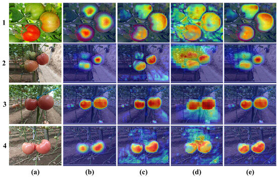 The Eigen-CAM technique was used to visualize the tomato detection results and highlight the image regions that the models focused on during prediction [39]. Experiments were conducted on the test set using the YOLOv5s-seg, YOLOv8s-seg, YOLOv11-seg, and FGS-YOLOv8s-seg models, and Eigen-CAM heatmaps were generated for each image. The experimental results are shown in Figure 14. As shown in Figure 14, panel d1 and d3, although YOLOv11-seg can capture all the features of the tomato target, it has difficulty handling the interference caused by the complex environment, causing the model to over-focus on the image background and produce many false detections against the complex background (Figure 13, panel d3 and d5). Although YOLOv5s-seg can eliminate most of the interference caused by the complex environment, it ignores the edge feature information of many targets (Figure 14, panel b1, b2 and b4), thereby increasing the probability of missed detection (Figure 13, panel b2 and b4). Compared with the three baseline models of instance segmentation detection, YOLOv8s-seg shows better performance in target edge detection capability and comprehensive processing of complex environmental information interference. However, in the backlight environment, as shown in Figure 14, panel c4, the detection effect of the YOLOv8s-seg model still needs to be improved, and part of the detection computing power is still focused on the image background. The improved FGS-YOLOv8s-seg model can focus more on the recognition of tomatoes, effectively eliminate the interference of complex backgrounds, and achieve more accurate tomato detection and positioning. Additionally, the FGS-YOLOv8s-seg model also has an enhanced ability to recognize individual tomatoes and tomato clusters against complex backgrounds, which fully demonstrates the effectiveness of the improved module.