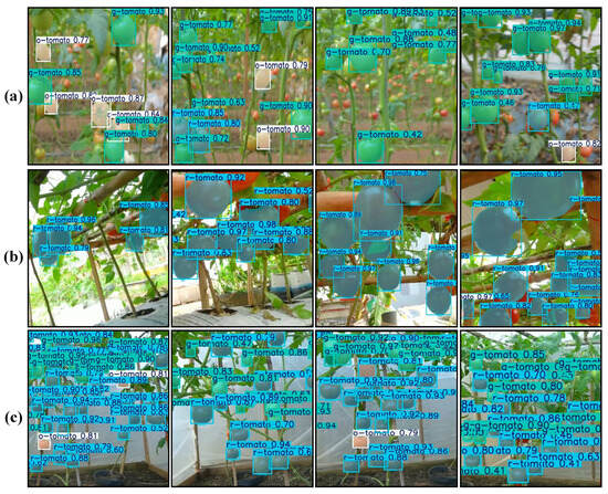 The traditional method for assessing tomato maturity relies primarily on experience and sensory testing [5,6]. Although offering advantages such as low cost and simplicity, it suffers from strong subjectivity, environmental interference, and inefficiency. These limitations make it difficult to ensure consistency and accuracy, rendering it unsuitable for large-scale cultivation scenarios [7]. With advances in high-performance image processors and the availability of millions of labeled data samples, deep learning models have achieved breakthroughs in fruit detection [8,9,10,11,12,13,14], particularly in efficient and accurate identification of tomato varieties and their phenotypic characteristics [15,16]. Wang et al. proposed the PDSI-RTDETR model for tomato maturity detection, achieving an mAP50 of 86.8–3.9% higher than the original RT-DETR with 17.6% lower GFLOPs [4]. Wang et al. designed the MatDet model for tomato maturity detection, attaining an mAP of 96.14% and demonstrating excellent performance in complex scenarios [17]. Gu et al. improved the RTDETR model for tomato fruit detection and phenotyping, achieving 88.3% precision, an mAP0.5 of 0.86, and a correlation coefficient of 0.79 for fruit diameter calculations [18]. Zhang et al. proposed a cascaded deep learning network based on YOLOv5 for tomato detection and classification, achieving a precision of 82.4% and a recall of 90.9% for unobstructed tomatoes. In addition, the network achieved an average precision of 96.9% for tomato maturity classification and a detection speed of 20 fps [19]. Zeng et al. optimized the YOLOv5 model for real-time tomato detection and maturity assessment, reducing the model size and FLOP by 51% and 84.15%, respectively. Meanwhile, the model achieved an mAP of 96.9% and a detection speed of 26.5 fps [20]. The MTD-YOLOv7 model [21] and LACTA algorithm [22] were applied to cherry tomato maturity detection, achieving accuracies of 86.6% and 94%, respectively.