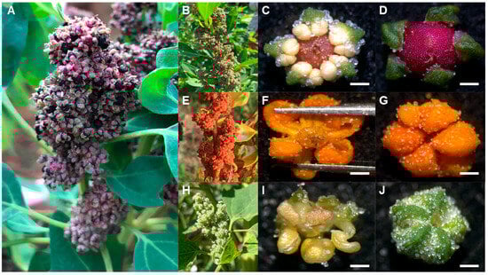 During growing and flower development of quinoa, different growth habits and morphological changes in flower organs, plant color, shape and density of the panicles, and grain shapes/color were continuously observed (Table S2). The morphological traits of offsprings resembled that of the maternal parent, showing a branched growth habit. However, the phenotypes of flower inflorescences varied greatly, compared with their paternal generation, forming three different ecotypes based on their fertility: the fertile F, the sterile S1, and the sterile S3. The F ecotype accounted for 20% of offspring plants and possessed regular flower tissue, with more than 95–98% of normal flowers in a compact amaranth-form inflorescence (Figure 1A,B). In flowers of the F ecotype, the hermaphrodite ones were located at the distal end and bore five perianth lobes, five dominant anthers, and a superior ovary with two or three stigmatic branches. The remaining offspring plants (80%) were composed of S1 and S3 ecotypes. The S1 and S3 both presented a loose, glomerular inflorescence and six sepals. However, the stamens were completely absent throughout the whole inflorescence in the S1 ecotype, which only showed bifurcate or trifurcate stigma (Figure 1F). The S3 ecotype still possessed exserted and bifurcate stigmas, of which few stigmas were aborted. In addition, all anthers in the flowers of the S3 ecotype were aborted across the whole inflorescence (Figure 1I). Incomplete filaments were found in some inflorescences of S3 plants.
