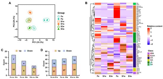 The summary of metabolite profiling on phytohormones in different quinoa flowers. (A) Principal component analysis on detected phytohormones. (B) The relative contents of detected phytohormones in different quinoa flowers. The number of differentially accumulated hormones from the comparisons of different ecotypes at the early (C) and later stages (D). The up and down indicate the content in the latter ecotype were higher and lower than in former ecotypes, respectively, in each comparison.
