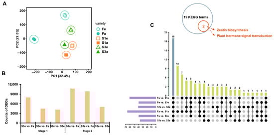 The high-quality reads (Q20 > 97.6% and Q30 > 93%) (Table S4) were mapped to the reference genome. The genes with a threshold of 0.5 in the average FPKM across all samples were defined as expressed genes, yielding 29,687 genes in the present research. The PCA of gene expression, representing 60.0% of the total variation, distinguished three ecotypes clearly (Figure 3A). In contrast to hormones, the gene expressions of the three ecotypes were distributed widely (Figure 3A), indicating the great variation in gene expression among ecotypes at two stages. In detail, 8002 and 10,716 DEGs were identified between fertile F and S1 ecotypes at the earlier and later stages, respectively. In addition, 4500 and 9882 DEGs were identified between the fertile F and S3 ecotypes at the earlier and later stages, respectively. These numbers of DEGs between sterile F and the other two sterile ecotypes, compared to that between S1 and S3 at both developmental stages (4203 for S1e vs. S3e and 5052 for S1a and S3a, accordingly) (Figure 3B), indicate that there could be more comprehensive regulations in determining the fertility of quinoa. To obtain the possible regulators distinguishing three ecotypes based on floral organs during their development, the KEGG enrichment analysis was performed on their DEGs, showing extensive gene regulations (Figure 3C). Interestingly, the most regulated pathways between the F and S1 ecotypes at two developmental stages were observed, showing 62 and 61 significantly changed pathways. A total of 19 KEGG terms were identified based on the comparisons between two stages of three ecotypes (Figure 3C). Among these KEGG terms, zeatin biosynthesis and plant hormone signal transduction were identified and associated with fertility (Table S5), suggesting the potential role of phytohormones in regulating flower ecotypes.