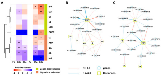 The contents of phytohormones related to zeatin biosynthesis and plant hormone signal transduction (A) and their correlations with DEGs: (B) zeatin biosynthesis and (C) plant hormone signal transduction. The insignificant correlations (p > 0.05) were filtered out. * and ** represent significant differences at p < 0.05 and p < 0.01, respectively.