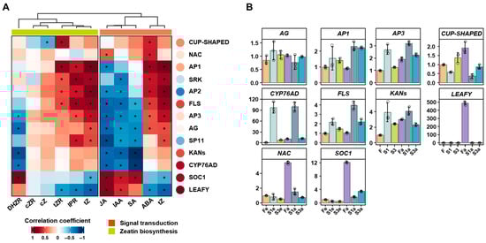 The expressions of 13 selected genes related to flower development. (A) The rectangle heatmap shows correlations between the levels of hormones and 13 selected genes from signal transduction and zeatin biosynthesis. The circle heatmap (right side) shows the correlations between the RT-PCR values and FPKMs of 13 selected genes. * represents significant correlation at p < 0.05. (B) The RT-PCR values of 10 genes, showing a positive trend with their FPKMs, in different fertile ecotypes and developmental stages.