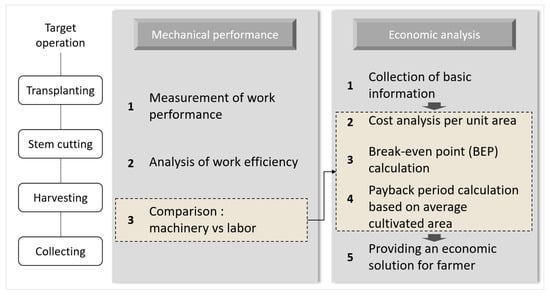 To evaluate the performance and economic feasibility of agricultural machinery, this study followed a structured procedure, illustrated in Figure 1, consisting of a mechanical performance analysis and an economic analysis.
