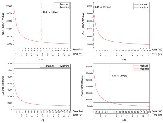 This study conducted not only a technical performance evaluation and quantitative comparison of mechanized and manual labor but also an economic analysis to comprehensively assess the field applicability of mechanization in actual farming operations. The economic analysis quantitatively assessed the cost-saving potential and operational efficiency of mechanized work, thereby evaluating the practical feasibility of mechanization. Cost-saving effects were examined by comparing the BEPs of adopting mechanization based on total costs, including variable costs (e.g., labor costs) for manual operations and both fixed (e.g., machinery purchase, depreciation, and interest) and variable costs (e.g., labor and fuel) for mechanized operations. In this analysis, crop marketability and quality factors were also recognized as variables that may influence economic feasibility. However, this study focused on fixed and variable costs, which have a more direct and dominant impact on economic outcomes. Accordingly, quality-related factors were excluded from the evaluation criteria to enable a quantitative comparison centered on cost structure. The break-even analysis took two additional practical criteria into account: cultivation area and time (years). Operational efficiency was analyzed based on the FER. The economic analysis was conducted under the assumption that the tractor was rented and the implements were purchased.