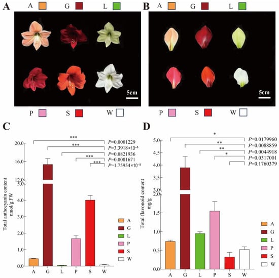 Whole flowers (A) and single sepals (B) in six experimental cultivars. A, ‘Apricot Parfait’, G, ‘Grand Diva’, L, ‘Luna’, P, ‘Pink Rival’, S, ‘Souvenir’, and W, ‘Wedding Dance’. Scale bar represents 5 cm. (C,D). Total anthocyanin and total flavonoid content in the petals of six cultivars. ‘Wedding Dance’ used as the common comparator. All data were means (±SE) of three independent biological replicates (* p < 0.05, ** p < 0.01, *** p < 0.001).