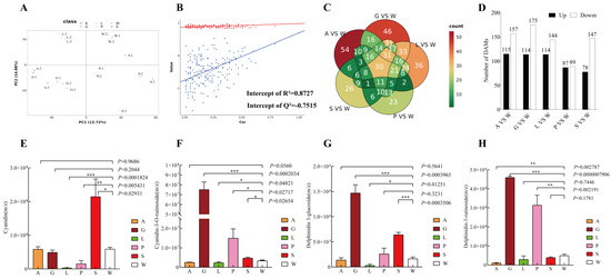 Metabolomic assessments of flowers from Hippeastrum varieties. (A,B) PLS-DA analysis (Partial Least Squares Discriminant Analysis) of the derived data of Apricot Parfait (“A”), Grand Diva (“G”), Luna (“L”), Pink Rival (“P”), Souvenir (“S”) vs. Wedding Dance (“W”). (C) Venn diagram of differentially accumulating metabolites (DAMs) in the following comparisons A, G, L, P, S vs. W. (D) Bar chart showing the differentially accumulating metabolites (DAMs) targeted by comparisons of, respectively, ‘Apricot Parfait’, ‘Grand Diva’, ‘Luna’, ‘Pink Rival’, and ‘Souvenir’ vs. ‘Wedding Dance’. (E–H) The levels of metabolites (based on m/z abundance) from metabolomic data, cyanidin (E), cyanidin-3-O-rutinoside (F), delphinidin 3-glucoside (G), delphinidin 3-rutinoside (H). ‘Wedding Dance’ used as the common comparator. All data were means (±SE) of three independent biological replicates (* p < 0.05, ** p < 0.01, *** p < 0.001).